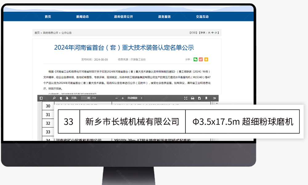 近日,河南省工業(yè)和信息化廳公布了2024年河南省首臺(tái)(套)重大技術(shù)裝備認(rèn)定名單,新鄉(xiāng)市長(zhǎng)城機(jī)械有限公司φ3.5×17.5m超細(xì)粉球磨成功入選。這已是新鄉(xiāng)長(zhǎng)城第三次入選“河南省首臺(tái)(套)重大技術(shù)裝備”。